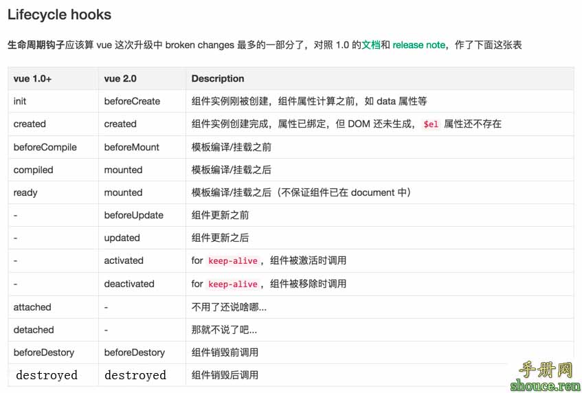 也有一些其它的钩子,在实例生命周期的不同阶段调用,如 mounted、 updated 、destroyed 。钩子的 this 指向调用它的 Vue 实例。一些用户可能会问 Vue.js 是否有“控制器”的概念?答案是,没有。组件的自定义逻辑可以分布在这些钩子中。