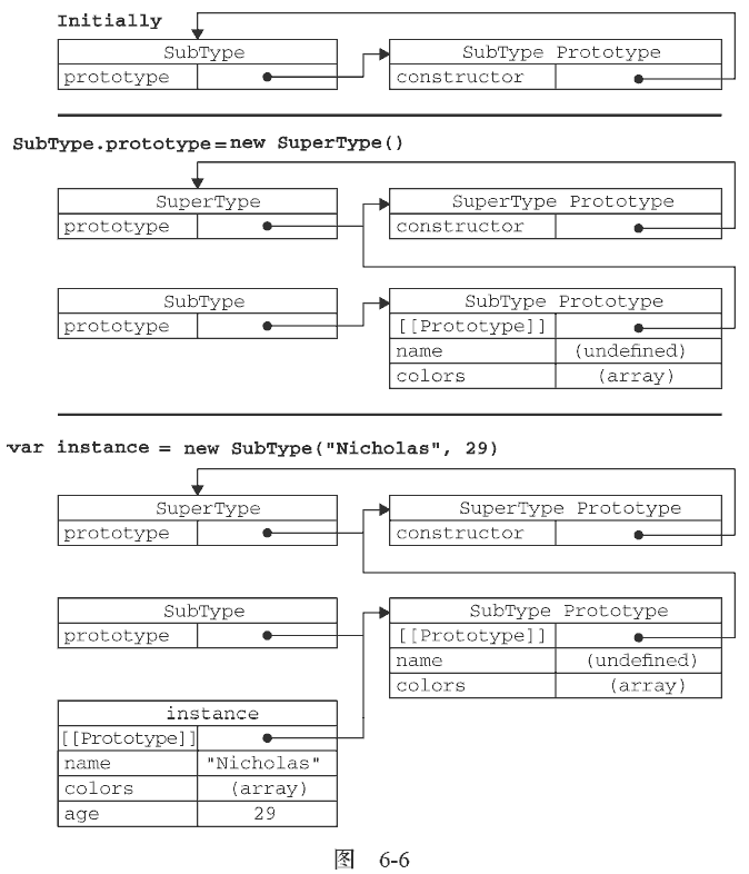 加粗字体的行中是调用SuperType 构造函数的代码。在第一次调用SuperType 构造函数时,SubType.prototype 会得到两个属性:name 和colors;它们都是SuperType 的实例属性,只不过现在位于SubType 的原型中。当调用SubType 构造函数时,又会调用一次SuperType 构造函数,这一次又在新对象上创建了实例属性name 和colors。于是,这两个属性就屏蔽了原型中的两个同名属性。图6-6 展示了上述过程。