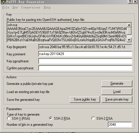 该工具可以生成三种格式的key :SSH-1(RSA) SSH-2(RSA) SSH-2(DSA) ,我们采用默认的格式即SSH-2(RSA)。Number of bits in a generated key 这个是指生成的key的大小,这个数值越大,生成的key就越复杂,安全性就越高。这里我们写2048.