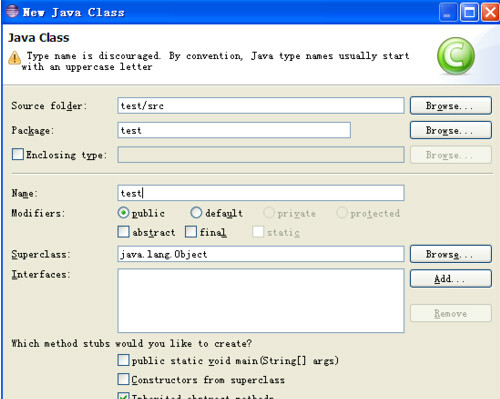键入类名,如输入 test,如图,然后点击finish