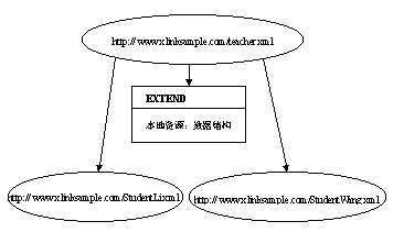 链接弧(arc)用于表示扩展XML链接中资源之间的连接关系,它是扩展XML链接元素的子元素,xlink:type属性值为"arc",称之为链接弧元素。在用有向图描述扩展XML链接时,链接弧是连接资源的有向边,不过后面我们将要讲到,一个链接弧元素未必只表示一条有向边。在有向图中,随着结点个数的增加,其边的数目将指数级增加。因此在扩展XML链接中,随着资源的增加,连接的数量也会指数级增加。例如:如果一个扩展XML连接的资源由3个增加到4个,可能的连接数目将从9个上升到16个。 如果一个链接弧的起始资源在本地,而目标资源是远程的,那么这个链接弧称为出站(outbound)链接弧;反之,如果起始资源是远程的,而目标资源在本地,则称为入站(inbound)链接弧;如果起始资源和目标资源都不在本地,则称为第三方(third-party)链接弧。虽然没有作明确规定,但一般而言,一个链接一般只包含一类链接弧,因此可称为出站链接、入站链接或第三方链接。对HTML链接和简单XML链接而言,由于链接总是从链接元素到href代表的远程资源,因此都属于出站链接。扩展XML链接可以包括三种链接中的任意一种。 链接弧元素本身必须作为扩展XML链接元素的直接子元素,否则该元素将失去其链接意义。元素中可以包含任何内容,在一般情况下,这些内容不具有链接意义。链接弧元素中的属性可以有遍历属性(xlink:from和xlink:to)、行为属性(xlink:show和xlink:actuate)和语义属性(xlink:arcrole和xlink:title)。 xlink:from和xlink:to属性用于描述资源之间的连接,资源元素的标识通过其xlink:label属性识别。xlink:from定义了链接弧的起始资源,在有向图中是边的起点,xlink:to定义了链接弧的目标资源,在有向图中是边的终点。遍历属性的取值必须是资源元素(包括本地资源元素和远程资源元素)的xlink:label属性已经定义的值。总之,链接弧表示从xlink:from所代表的资源元素到xlink:to代表的资源元素之间的连接。由于xlink:from、xlink:to和xlink:label属性用于链接的遍历,因此这三个属性常被称为遍历属性(traversal attributes)。 如果xlink:from和xlink:to的值对资源元素是唯一的,即只有一个资源元素的xlink:label属性具有xlink:from或xlink:to指定的值,那么这个链接弧只包括一个连接,在有向图中表现为一条边。如果xlink:from和xlink:to的值对资源元素不唯一,即有多个资源元素的xlink:label属性具有xlink:from或xlink:to属性值,那么这个链接弧则表示多个连接,在有向图中表现为多条边。例如,下面例子中,扩展XML链接元素EXTLINK包含一个本地资源RESOURCE元素、三个远程资源LOCATOR元素和两个CONNECTION元素,它表示课程、教师和学生的关系。RESOURCE和LOCATOR元素的xlink:label属性依次定义为"DataStructure"、"teacher"和"student",CONNECTION元素的xlink:from和xlink:to的值必须为上述三个值之一。