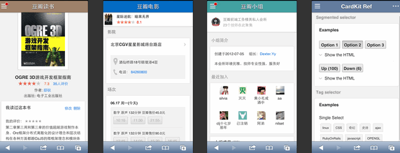 CardKit 是来自豆瓣的一个移动 UI 框架,使用 Card\Unit\Component 概念快速构建移动 Web 应用。应用外观跟原生应用无异。