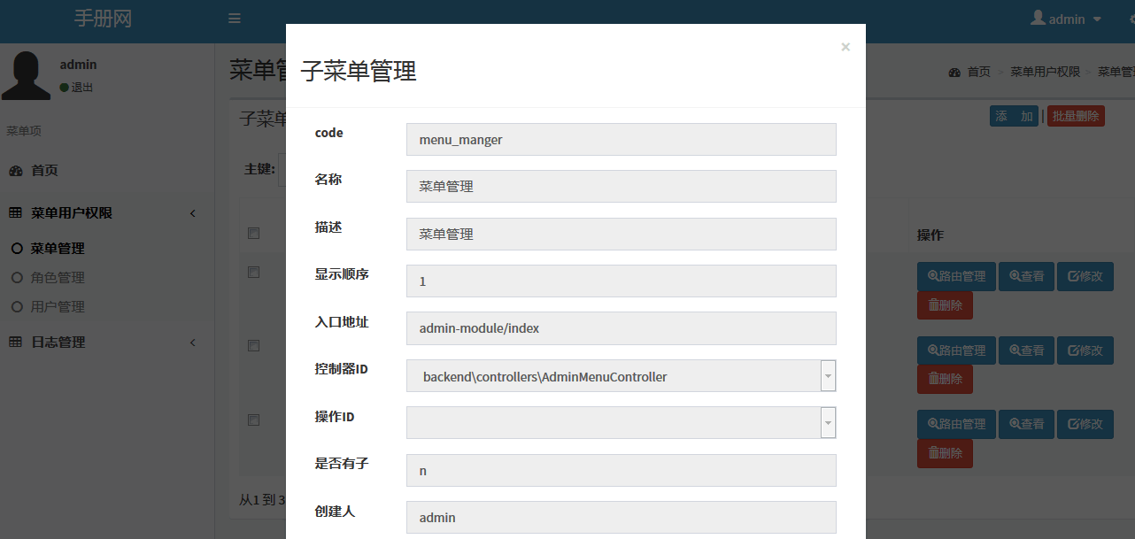 2、便捷的菜单、权限、用户管理,自动识别可用路由控制器,轻松钩选配置路由权限,无需手写配置路由地址。