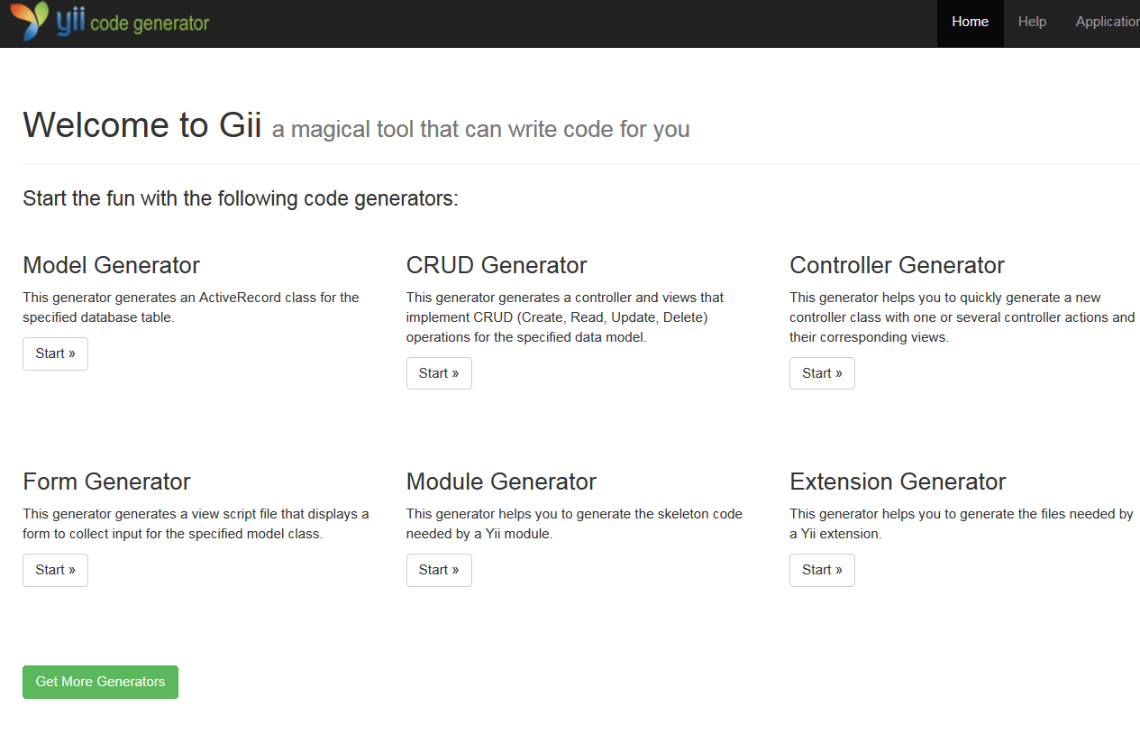 5、运行xxx.com/index.php?r=gii进入GII模块,之后就可以自动生成你的模块了,如图: